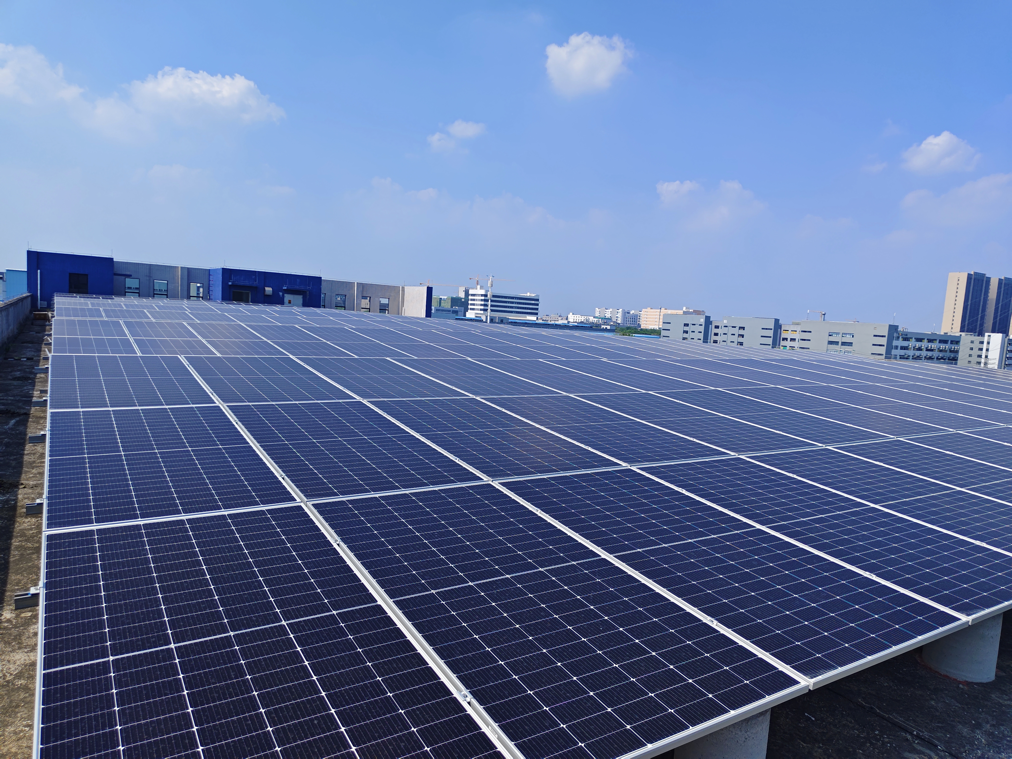 该分布式光伏电站项目充分利用了太阳集团电气的4个厂房楼顶资源,总面积约40000平方米,装机容量4MW。项目并网后采用“自发自用,余量上网”的模式,项目运营期为25年,平均每年可为电网提供绿色电量333.77万千瓦时,每年可节约标煤约1031.35吨,减少2681.51吨二氧化碳和28.88吨二氧化硫气体排放,在工厂用电高峰时间段能有效缓解五沙片区电网供电负荷压力,提高了片区用电的可靠性和稳定性。
