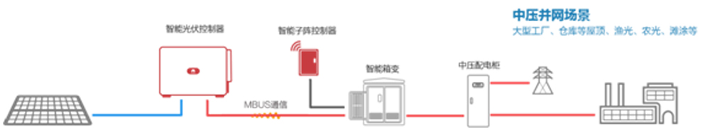 并网光伏发电系统是指太阳能电池利用太阳辐射能量产生的直流电(即太阳电池的“光生伏特效应”)通过并网光伏逆变器转换成交流电向电网输送的系统,其本质是利用太阳能进行发电的发电站。与煤、石油和天然气等传统能源进行发电的发电站系统相比,并网光伏发电系统具有可再生、无污染等优点。该光伏项目采用10kV等级高压并网方式,光伏系统包含一套太阳集团电气自主制造的10kV等级4000kVA预装式光伏升压站、7160块光伏组件、13组300kW大功率智能组串式光伏逆变器、一套10kV智能并网开关柜等组成,光伏组件通过光生伏特效应产生电流,然后通过组串式逆变器进行逆变,将直流电转换为交流电,最后就地升压至10kV接入电网。